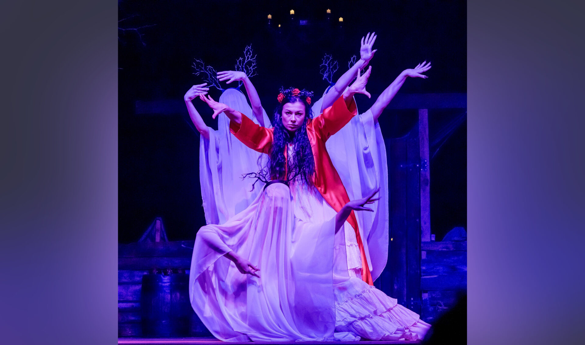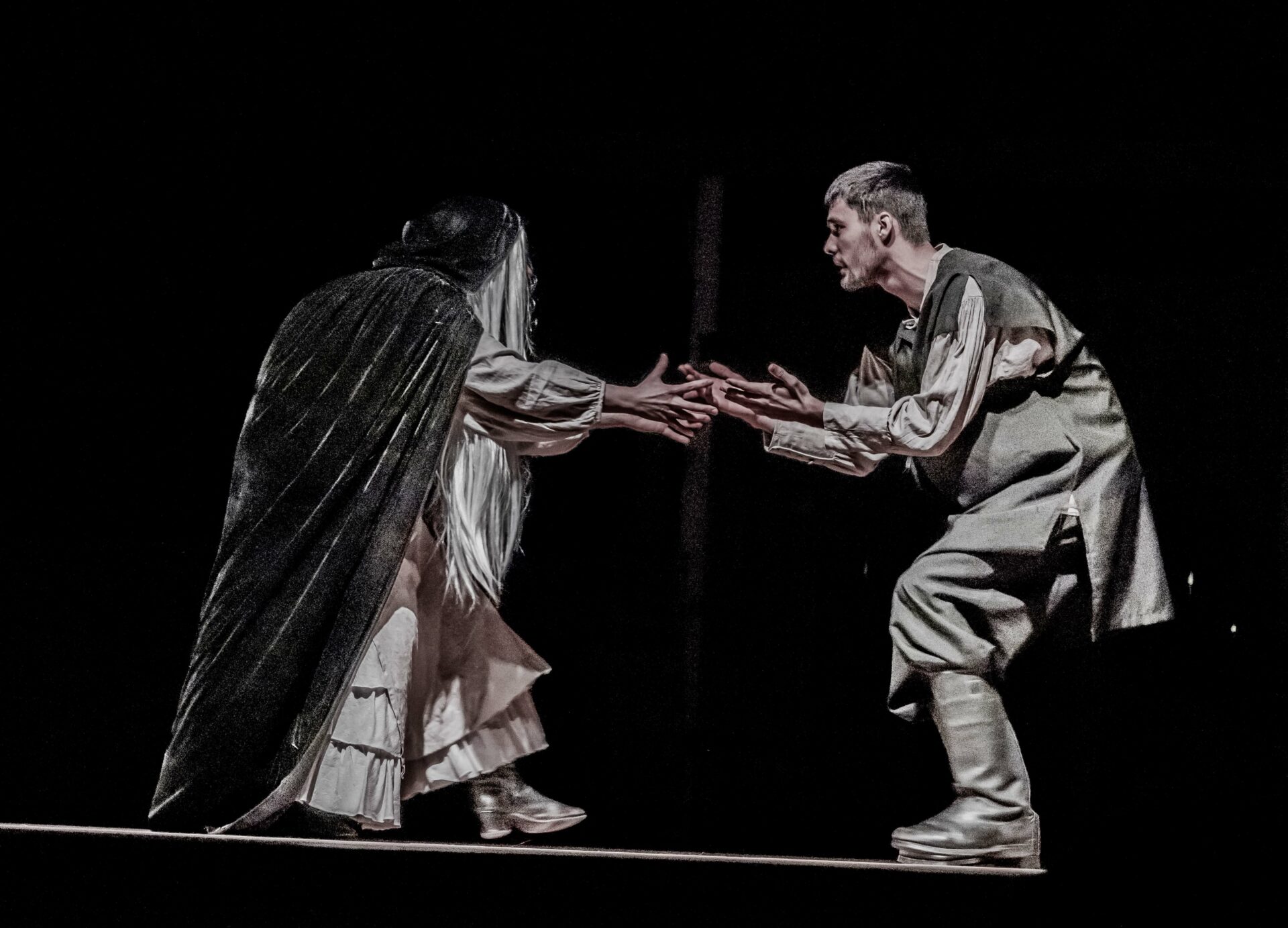 Открывается занавес, условный или реальный – решать зрителю. И начинается действо. Дмитрий Мунтян играет Хому, Екатерина Ковальская – Паночку, а Дарья Васильева, София Онищук и Алиса Гуцу – трёх рассказчиц. Артём Гараба, Марк Гуцу, Сергей Бурбела – казаков. Александр Репида – Сотника.