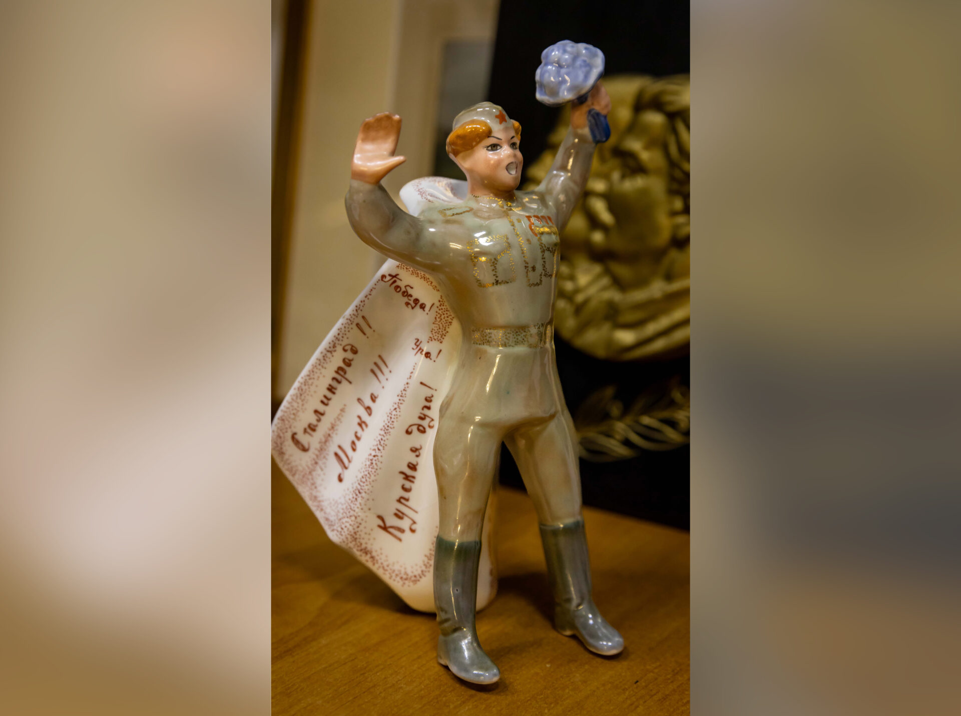 Можно это сделать и сегодня. В преддверии празднования 80-летия Великой Победы мы, конечно, поинтересовались, есть ли в наличии фарфоровые статуэтки, рассказывающие о событиях периода Великой Отечественной войны. Оказалось, есть. Например, коростенская фарфоровая статуэтка «Солдат с букетом»: советский воин, на развевающихся крыльях плащ-палатки которого чётко выведены слова «Москва», «Сталинград», «Курская дуга», «Берлин», «Рейхстаг» и, наконец, «Победа». Или парные фигурки «На парад!» Ленинградского фарфорового завода, выпущенные во второй половине 50-х: девочка с цветами, мальчик с воздушными шариками. Очень позитивные и бесконечно трогательные.