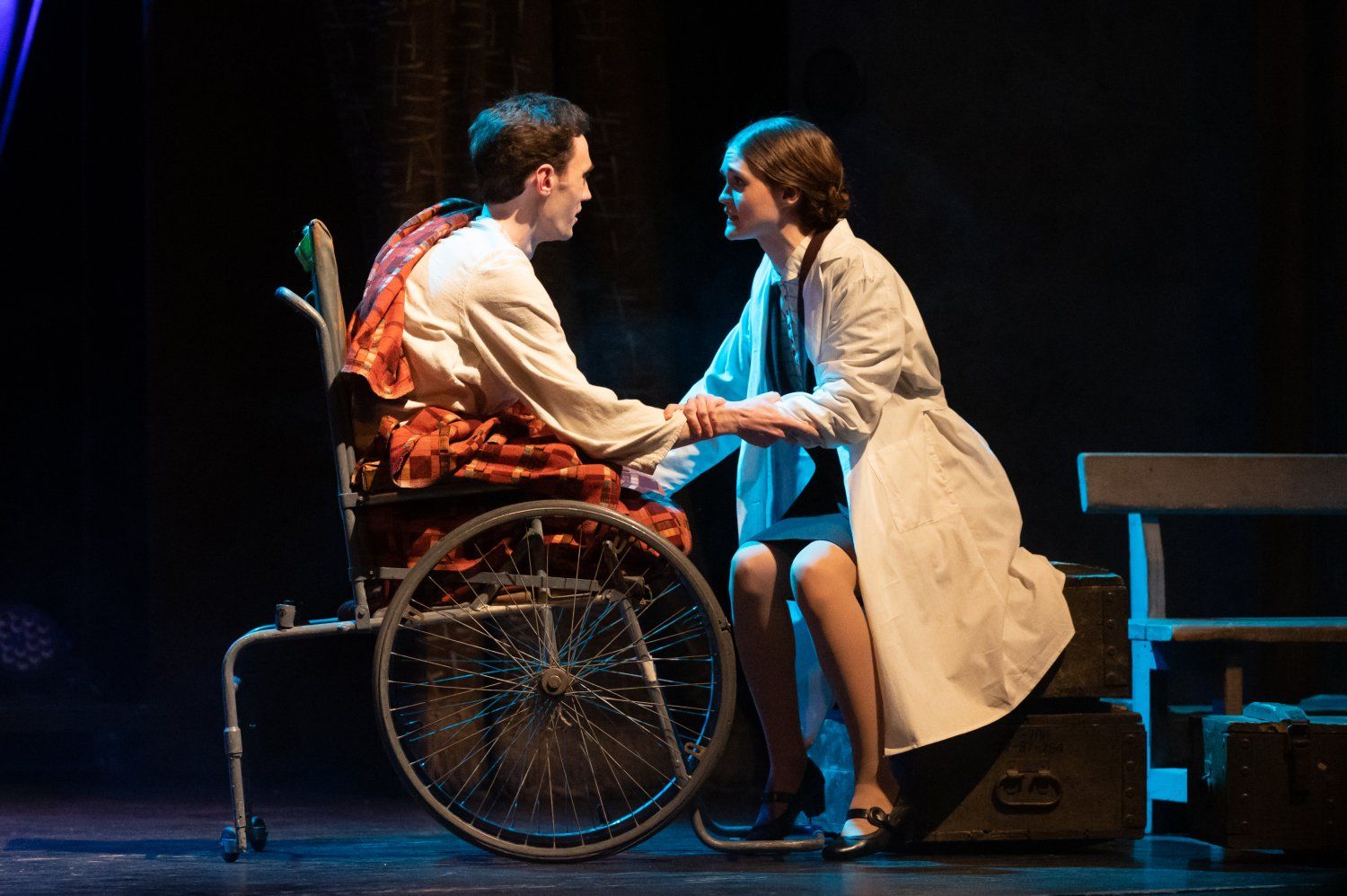 Командир танкового экипажа И. Морозов в ходе Ленинградско-Новгородской стратегической наступательной операции в конце января 1944 года был очень тяжело ранен, лишился обеих ног и левой руки. Конечно, на театральной сцене такие вещи передаются не буквально, а с помощью эмоций и символов. Звуковые эффекты тоже помогают создать нужную атмосферу в душах зрителей. А ещё порой нарочито бесстрастные, а порой взволнованные голоса комментаторов, дающие возможность почувствовать масштаб тех событий: «За неполных пятьдесят дней наступления в северо-западном направлении Красная Армия продвинулась на глубину до 280 километров. Полностью сняла блокаду Ленинграда, освободив Ленинградскую и Новгородскую области. Действия Красной Армии сковали оставшиеся силы группы армий «Север», лишив их стратегического манёвра. Потери советской стороны составили более 76 тысяч убитыми и более 230 тысяч ранеными. К сожалению, без потерь не бывает побед. Каждый из этих 76 тысяч – чей-то сын, чей-то отец, чья-то дочь или мать. Большая трагедия каждой семьи, каждого человека».