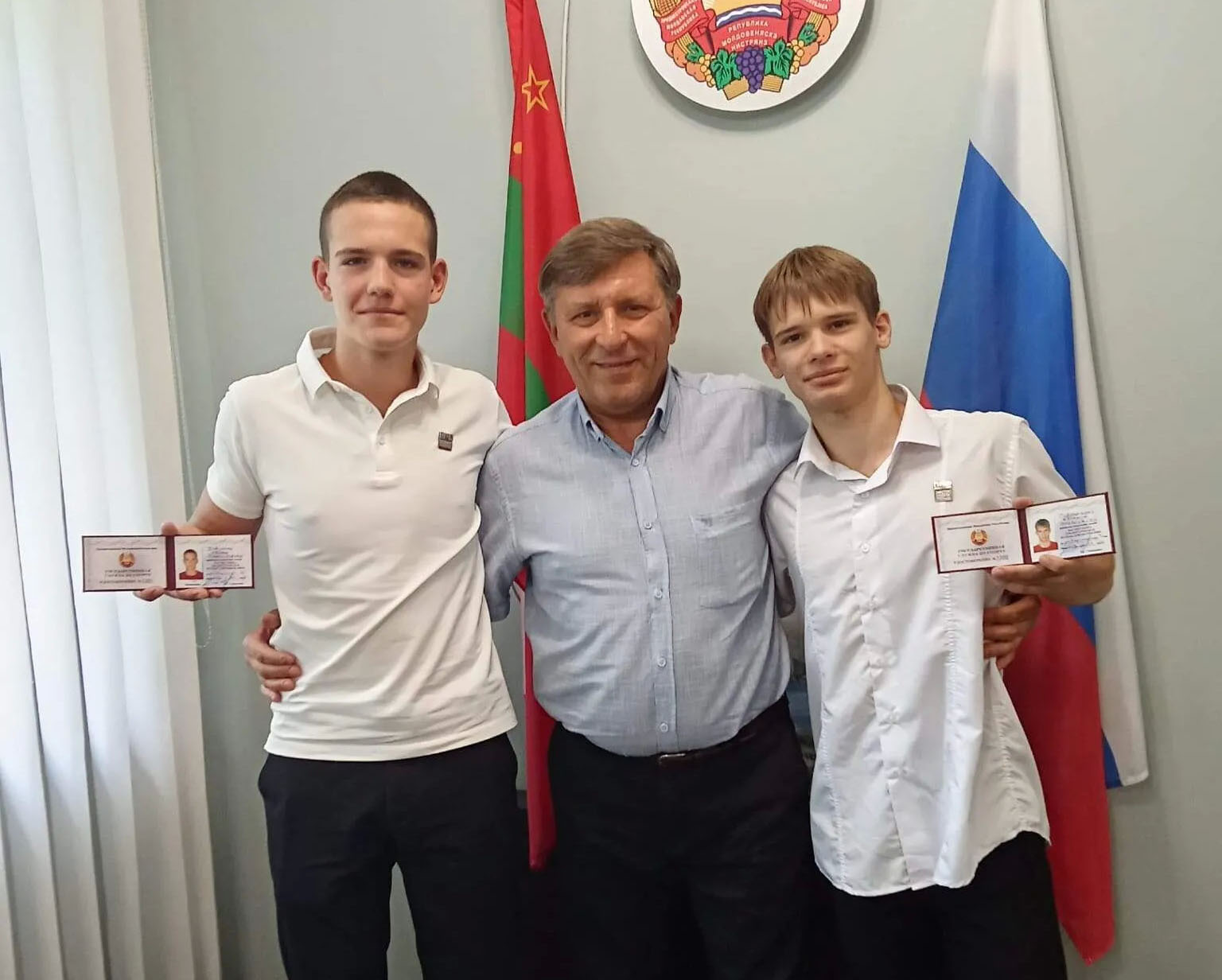 Заслуженный тренер ПМР и РМ Сергей Коровай стал бронзовым призёром на чемпионате мира по рукопашному бою в турецком городе Бурса в июне текущего года. А его воспитанники отличились на чемпионате Европы в румынском городе Половраги по универсальному бою, где Евгений Савранчук завоевал «золото», а Иван Павленко – «серебро». Все трое выполнили нормативы на присвоение звания «Мастер спорта по универсальному бою ПМР». Удостоверения рыбницким спортсменам вручила заместитель начальника госслужбы по спорту Нелли Телятинская.