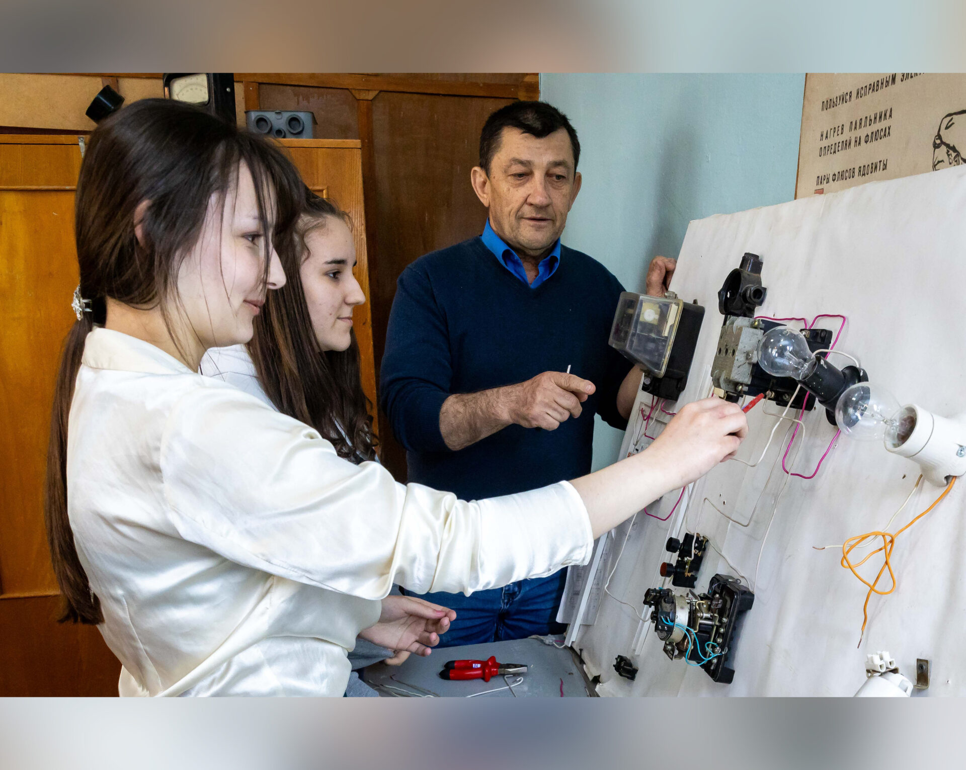 Директор техникума устроила нам экскурсию по учебному заведению. Просторные аудитории, отзывчивые преподаватели и такие интересные, умные студенты. В лаборатории, о которой только что шла речь, идёт занятие. Проводит его ведущий специалист по энергетическим специальностям Владимир Чимпоеш, некогда сам выпускник техникума. Его силами как раз и было создано это учебное пространство. Здесь ребята изучают монтаж, наладку, эксплуатацию электрооборудования промышленных и гражданских зданий. Замечаем среди студентов-ребят хрупкую девушку. «Она всё делает то же самое, что и мальчики, – смеётся заведующая практикой Жанна Евдокимова. – Эта хрупкая девочка уже и первый экзамен сдала на группу допуска. Голова у неё работает отлично». Знакомимся. Девушку зовут Саша Балан, учится на третьем курсе. Профессию выбрала, посоветовавшись с родителями. Впрочем, это уже династия, так как бабушка Александры в техникуме когда-то преподавала, а дедушка здесь учился. А вот второкурсник Михаил Балан под руководством мастера производственного обучения Вадима Расторубова в электромонтажной мастерской занимается настройкой стенда. «Поступил сюда, так как иметь специальность – это всегда хорошо, – улыбается парень. – Началась практика, и стало интересно. Наша специальность похожа на взрослый конструктор «Лего», который может убить, если не соблюдать правила безопасности. Но с этим у нас строго. После окончания техникума планирую поступить на станцию, там работал мой папа».