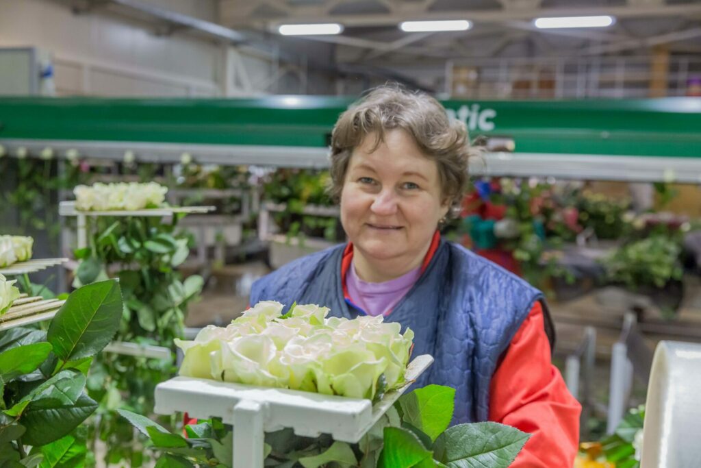 Темно-красная, крупнобутонная, популярная среди покупателей Монтана, алая Сальса, новый, выведенный на предприятии, красный сорт Би+, коралловая Джарджина, изысканный чайно-гибридный сорт Ревайл, желто-красный, похожий на пламя Лампион, насыщенный розовый Пинки Фреш, самый сложный и дорогой, с необычными розово-зелёными цветами сорт Сплэш Сенсейшн (роза-спрей, дающая много мелких бутонов), а также белые сорта Пич-Аваланж и Анабель, светло-кремовый Пич-Аваланж – эти и другие цветочные сокровища скрываются за плотными стёклами теплиц в насыщенной влагой и теплом атмосфере. Не всякий человек сможет долго в ней находиться, тем более постоянно работать. Но некоторым она очень даже по душе. «Прежде всего хочется назвать двух наших старших цветоводов – Валентину Мажар и Ольгу Крупа. Они трудятся на предприятии очень давно, передавая свои знания и опыт новичкам – молодым женщинам, желающим работать с цветами, среди цветов», – рассказал директор тепличного комплекса Сергей Голозов.