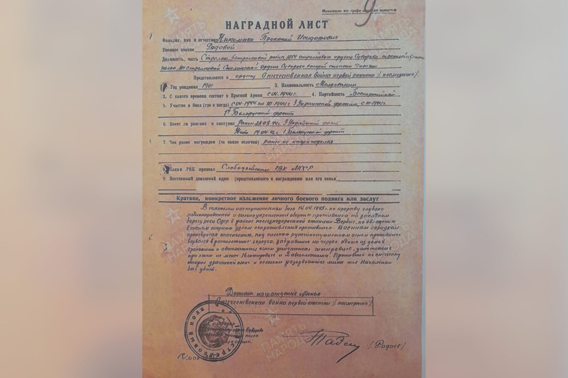 За проявленную храбрость в бою рядовой стрелок 5-й стрелковой роты 1054-го стрелкового ордена Суворова III степени полка 301-й стрелковой Сталинской ордена Суворова II степени дивизии Николенко Прокопий Сидорович 12 мая 1945 года наградным листом за подписью командира подполковника Радиева представлен к награждению орденом Отечественной войны I степени (посмертно).