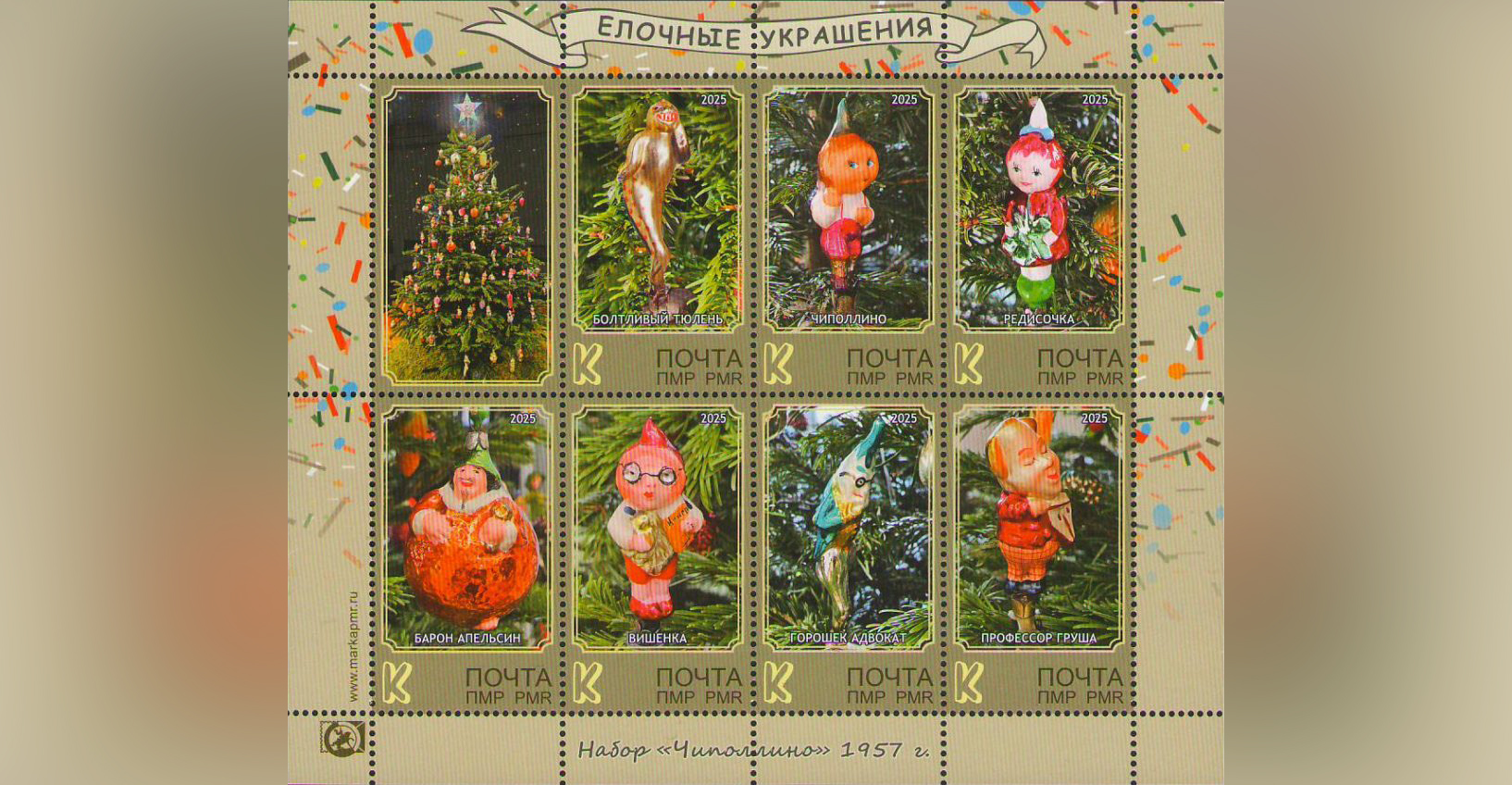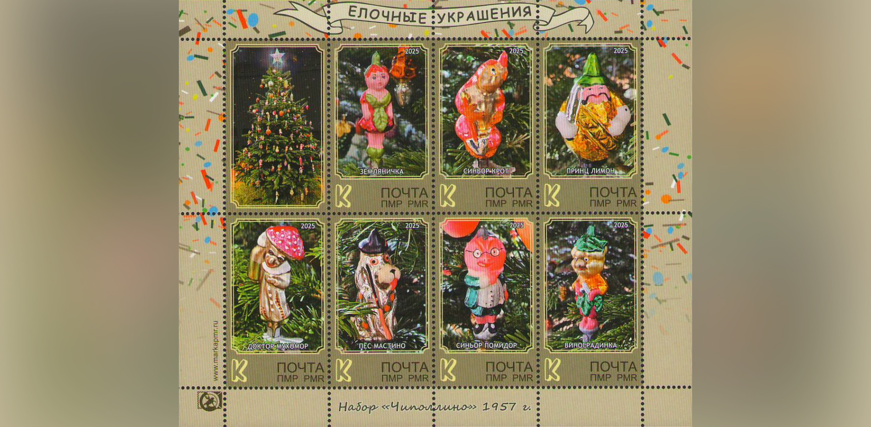 Когда-то их выпускали не столь массово, как сейчас, но зато они были куда более разнообразными, менее стандартными, ведь на фабриках ёлочных игрушек старого образца каждое такое миниатюрное изделие расписывали мастера ещё кустарным методом, вручную. Сегодня за ними охотятся коллекционеры, один из которых и предоставил издательству «Марка Приднестровья» серию ёлочных украшений из набора «Чиполлино» 1957 года выпуска. Так родился пятый по счёту новогодний выпуск марок в нашей республике – 14 маленьких красочных фотографий новогодних игрушек на двух марочных листах.