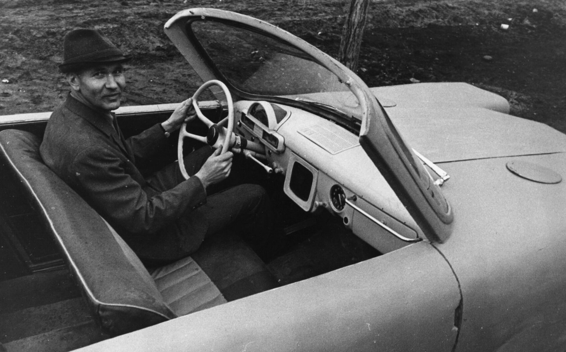 Обклеен лоскутами мешковины, прошпаклёван. Толщина стенок достигает трех-пяти миллиметров. Кузов получился не только исключительно прочным, но и красивым. Стремительность машины подчёркивают вытянутые линии, приподнятое, словно на взлёте, хвостовое оперение. За основу конструкции принята классическая компоновка: мотор спереди, ведущие колёса сзади. Машина рамной конструкции четырёхместная, двухдверная. Багажник сзади. Кузов открытый, спортивный. Но он имеет съёмную пластмассовую крышу, убирающуюся в багажник. Для туризма это очень удобно. В конструкции всё продумано. Начиная от самодельного руля повышенной прочности и дающего отличный обзор приборов до портативных радиоприёмника и телевизора. Кстати, телевизор тоже конструкции Филипенко».