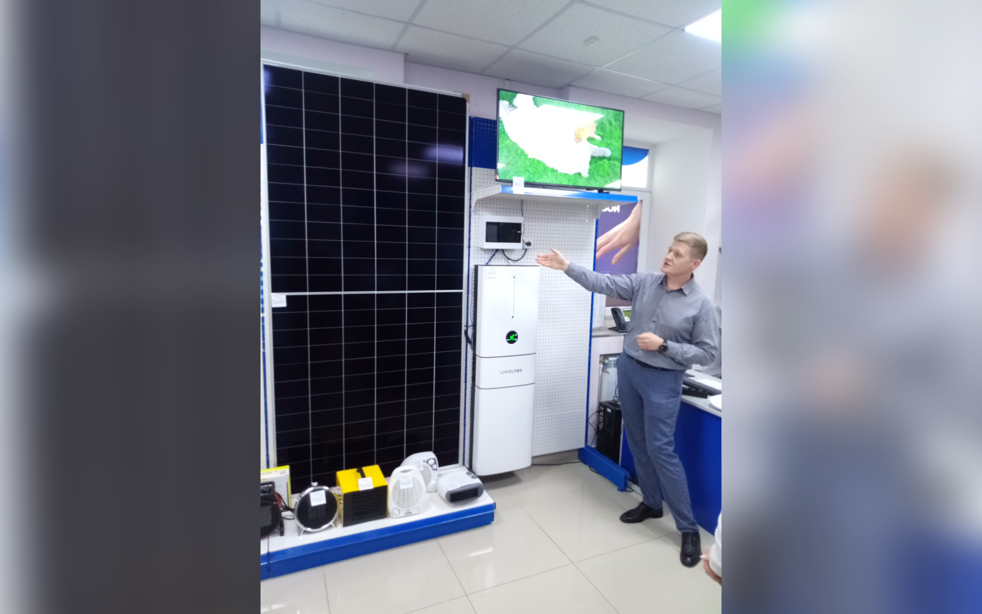Администратор торговых залов компании Максим Лопатенко показал домашнюю солнечную станцию, способную обеспечить жильё энергией. Мощности хватит и для зарядки электромобиля. Оборудование работает на приём и на выгрузку энергии, выполняет функции источника резервного питания, заблаговременно накапливающего ресурс.  Вниманию членов комиссии были представлены и кондиционеры с функцией приточки (подмеса) свежего воздуха, благодаря чему концентрация углекислого газа получается меньшей, а также кондиционеры с тепловым насосом – с возможностью работы до -25 и даже до -30°.