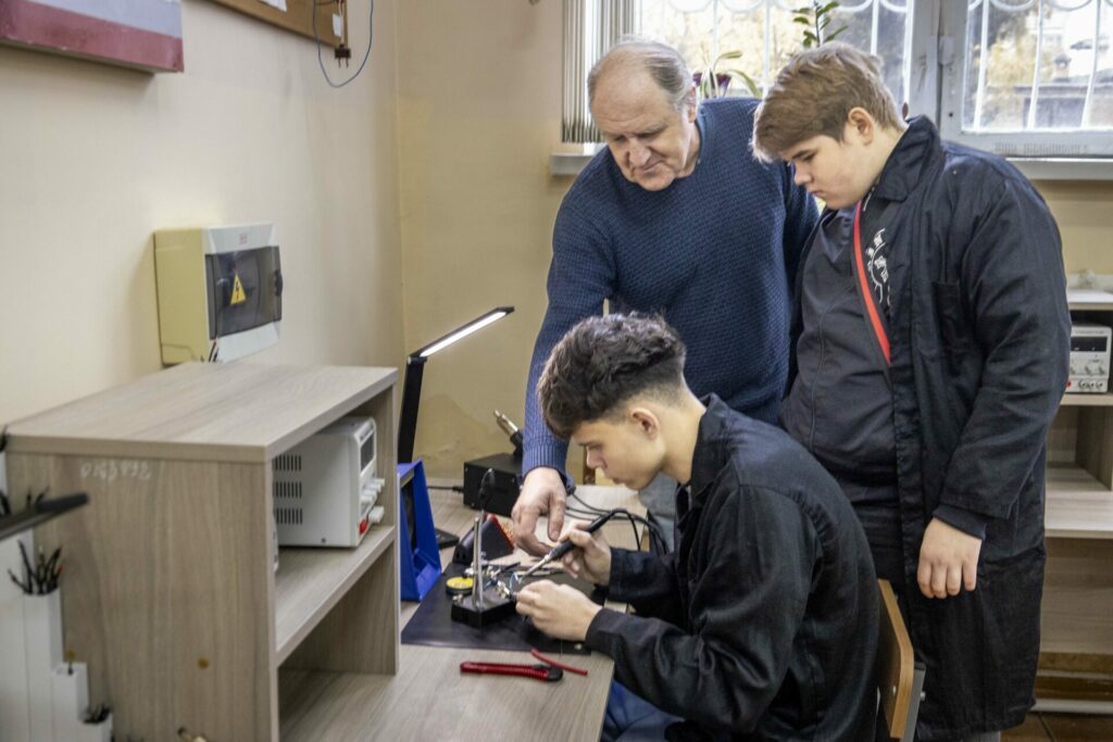 Посетили мы и кабинет производственного обучения, в котором шло практическое занятие первокурсников – будущих электромонтёров. Александр Мельник, мастер производственного обучения, пояснил: «У студентов это всего лишь второе занятие. Они учатся паять, лудить провода, а уже в дальнейшем будут собирать схемы, подключать питание». Александр Викторович уверен: для обучения в кабинете есть всё необходимое – тренировочные образцы, паяльные станции, вентиляционные вытяжки, лабораторные источники питания, макеты генераторов.
