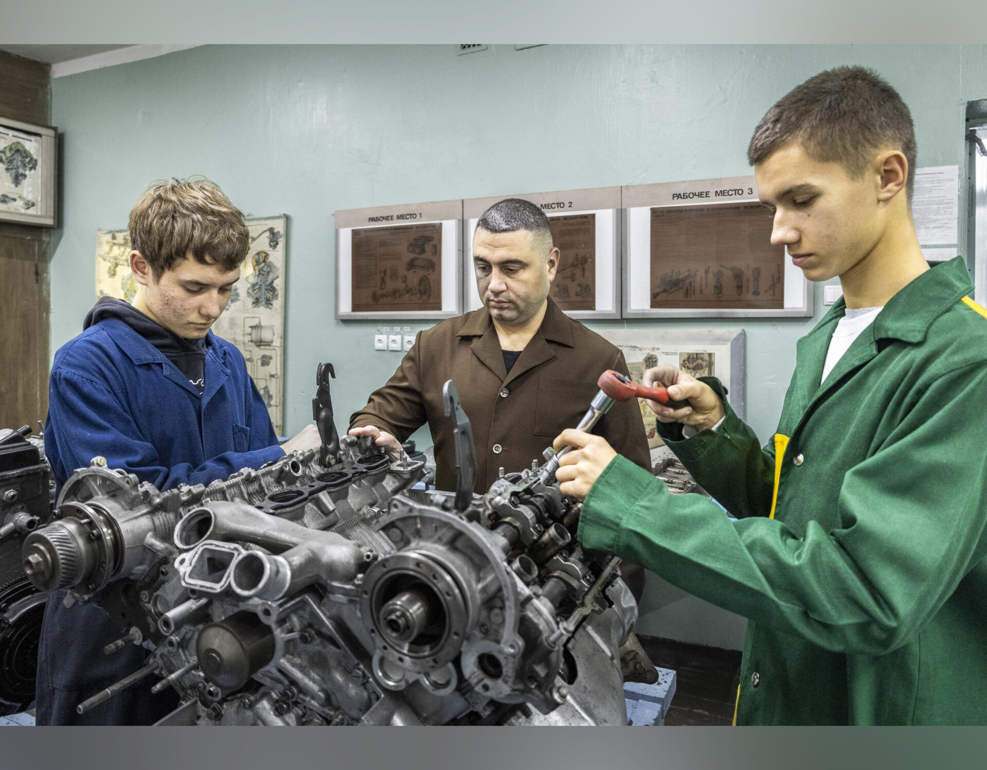 В мастерской техобслуживания автомобилей нас встретил мастер производственного обучения Валерий Виоара: «Здесь студенты, которые решили стать мастерами по ремонту и обслуживанию автомобилей, проходят учебную практику, отрабатывают необходимые навыки, осваивая азы сборки-разборки двигателей, коробок передач, мостов». Валерий Витальевич обратил наше внимание и на инструменты (отвёртки, молотки, гаечные ключи…), которыми учат пользоваться будущих автомехаников.